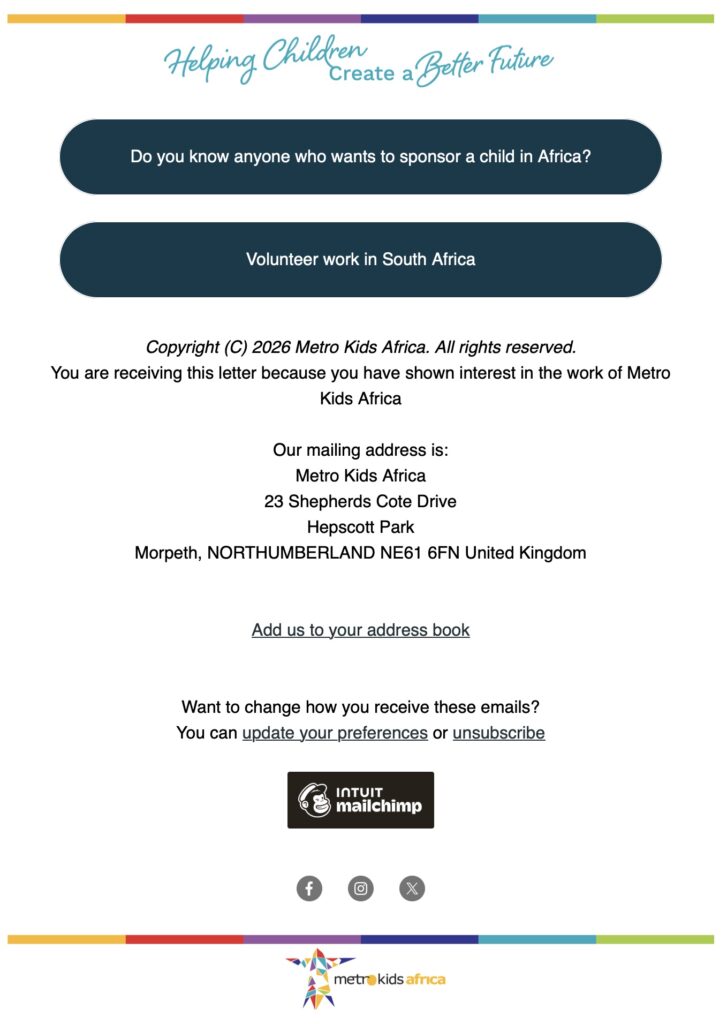 Thank you for all the incredible support that you give to Metro Kids Africa (MKA)! Without you, we would not be sharing God’s love with 85,000 children each week.